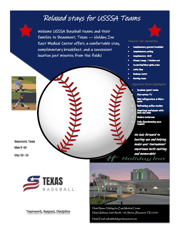 TEAMS CAN STAY WHERE THEY CHOOSE ,BUT WE DO HAVE A LOCAL HOTEL PARTNER THAT OFFERS A DISCOUNT TO USSSA TEAMS. HERE IS THE LINK BELOW
